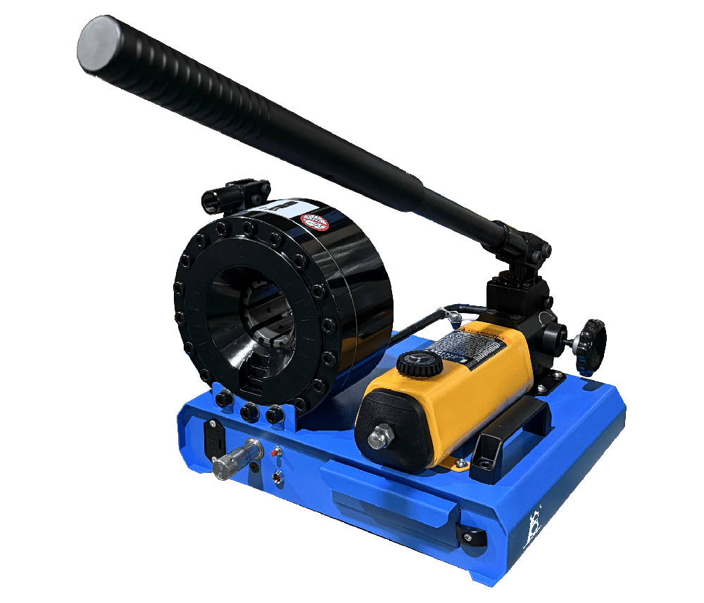 Серия ручных обжимных станков для Мобильного сервиса инновационного бренда из Поднебесной EA - P16 HР предназначена для работы с резиновыми гидравлическими рукавами высокого давления (РВД в сборе), пластиковыми изделиями, полипропиленовым и волоконным трубным прокатом, кабелями с полимерным защитным слоем. Устройство можно использовать в мобильных мастерских. Увеличенное усилие обжима станков этой серии (95,5 тонн!) позволяет гарантированно обжимать мультиспиральные рукава до DN19 (4SP & 4SH 3/4'') и 2-оплеточные рукава до DN25 (2SN-К & 2SC+ 1") включительно, а телескопический ручной насос позволяет работать на 25-30% быстрее с меньшими затратами энергии (за счет эффекта рычага).